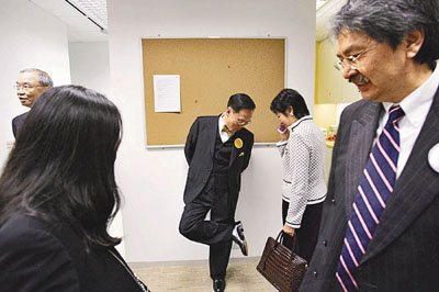■曾蔭權及太太快將告別位於灣仔的競選辦公室,昨特意再來「基地」,不知什麼原因,二人竟一起研究起鞋底來。