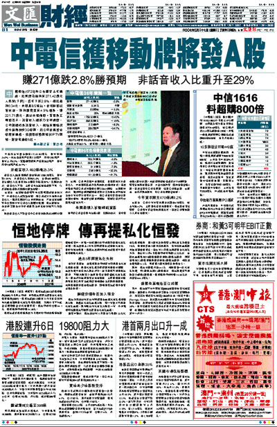 對於話音收入下跌會否令公司增加取得3G牌照的壓力,他稱,公司早已預料有關情況,並轉型加大非話音收入,料有關情況或令當局加快3G發牌步伐。至於市場有傳該公司將向聯通收購CDMA網絡,他回應時表示,雖然兩會期間總理溫家寶的工作報告亦列電信業為今年的四大改革行業一,但公司目前仍沒有收到有關的通知,假若要收購任何網絡,需依監管部門的意見和審批方可。