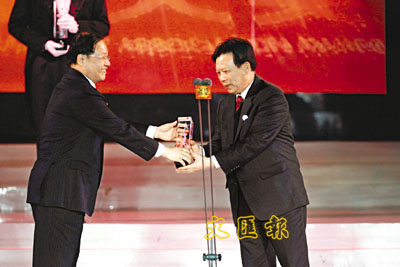 ■中國服裝協會常務副會長蔣衡傑為虎門頒獎,鍾淦泉(右)領獎。李濤 攝