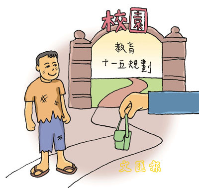 溫家寶總理在今年的政府工作報告中扼要地勾劃出教育十一五規劃的總體佈局,就是普及鞏固義務教育,加快發展職業教育,著力提高高等教育質量。此外,他還旁及兩點,一是支持和規範民辦教育發展,另一是採取兩大措施促進教育發展和教育公平,分別是加大獎助學金和貸款制度,及在教育部直屬師範大學實行師範生免費教育。總的來說,政策全方位面對各級學生,資源向農村和貧困家庭子女傾斜,既體現面向全體學生發展,又凸顯教育公平的主旋律。