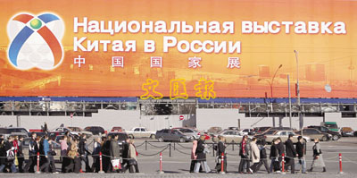 ■24日,在俄羅斯首都莫斯科紅場附近,遊人從「中國國家展」宣傳牌前走過。俄羅斯「中國年」開幕式將於26日在莫斯科克里姆林宮舉行。 新華社