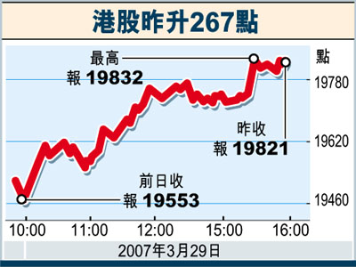 【本報訊】外圍股市個別發展,惟內地股巿創新高,加上基金季結,刺激港股於期指結算日扭轉兩日跌勢,單日升近270點。恆指開市受美股急跌影響低開83點,期後反彈並重上19,800點水平,高見19,823點,最多升278點。恆指收市報19,821點,升267點,全日成交急升上565.16億元。昨日期指結算,即月期指以19,692結算,全日收報19,691點,升167點,低水131點,成交合約10,729張。4月期指收報19,884點,升313點,高水62點,成交合約49,592張。
