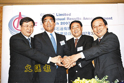 ■左起:中國海洋執行副總裁兼首席財務官楊華,董事長兼首席執行官傅成玉,執行董事周守為及高級副總裁、公司秘書及總法律顧問高志凱。本報記者張偉民 攝