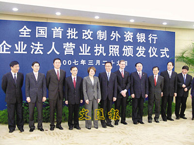 【本報上海新聞中心記者畢方方29日電】匯豐、渣打、東亞、花旗四家外資行的(中國)公司今日在上海市政府,獲得上海市工商局頒發的《企業法人營業執照》,標誌其已正式取得內地企業法人地位。除東亞銀行已明確表示將在下月2日(下周一)開展人民幣零售業務外,匯豐及花旗將在「下周早期」開展相關業務,而渣打則稱目前還沒有確定日期,但希望早日開展該項業務。