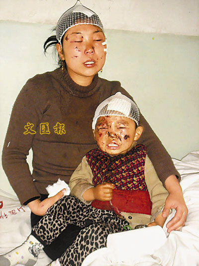 ■在爆炸中受傷的張某及3歲的兒子。本報山西傳真