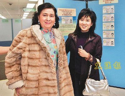 「十姑娘」在兒子何東舜銘、媳婦陳復生及工人攙扶下到港島中心換證。身穿皮草、花綠色旗袍、艷麗濃妝的十姑娘,明顯有備而來。