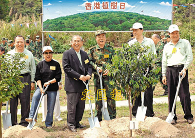 【本報訊】(記者 朱樂汶)今年香港回歸十年,剛好是香港植樹日舉辦第十次活動,種植的樹苗別具意義。植樹活動籌委會主席兼全國政協副主席董建華夫人董趙洪娉、中聯辦副主任李剛及政務司司長許仕仁,昨日均以一身輕便裝束,參與植樹日活動,他們與1000多名解放軍,以及2000多名不同社區代表,一起到大欖郊野公園,為下一代種下愛心樹苗,為香港的藍天打氣。