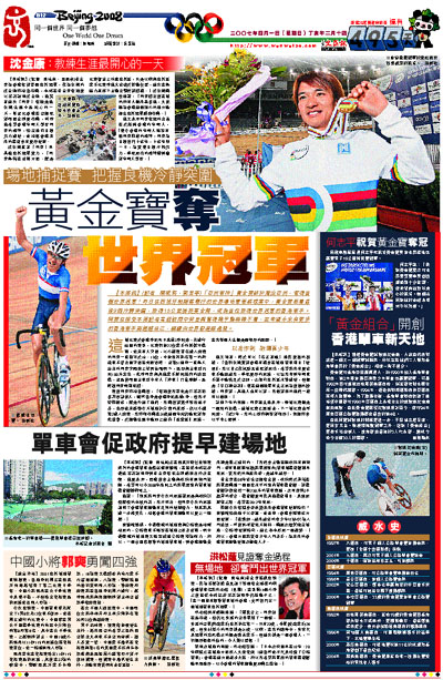 【本報訊】(記者 陳曉莉、郭思華)「亞洲車神」黃金寶終於衝出亞洲,奪得首個世界冠軍!昨日在西班牙帕爾馬舉行的世界場地單車錦標賽中,黃金寶憑著最後9圈冷靜突圍,取得15公里捕捉賽金牌,成為首位取得世界冠軍的香港車手。阿寶在接受本報記者電話訪問中笑言興奮得幾乎整晚睡不著,並希望未來有更多的香港車手能超越自己,繼續向世界級道路進發。