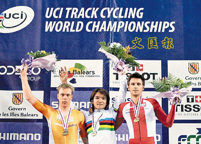 民政事務局局長何志平昨祝賀黃金寶勇奪世界場地錦標賽男子15公里捕捉賽冠軍。