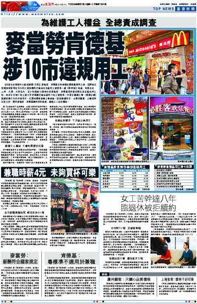 【本報北京新聞中心記者軼瑋1日電】麥當勞、肯德基日前被揭在廣東違規用工後,這兩家企業隨後被發現在多市的工資普遍低於當地法定最低工資標準。據《新快報》報道,包括北京、上海、天津、太原在內,至少有超過10個城市的麥當勞、肯德基等快餐巨頭企業在當地用工時,其非全日制小時工資水平涉嫌違反當地最低小時工資標準。中華全國總工會(簡稱全總)相關官員今日向本報表示,已責成廣東省總工會調查。該官員還表示,若情況屬實,工會將與企業交涉,要求麥當勞、肯德基盡快採取措施,維護工人合法權益。