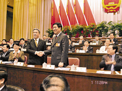 ■新當選的廈門市十三屆人大常委會主任何立峰(右)和十二屆人大常委會主任洪永世親切握手。本報記者李方芳攝
