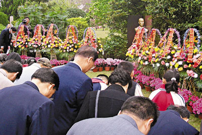 【本報上海新聞中心實習記者唐湛嫣1日攝】紀念中國著名社會活動家、新聞工作者、國際問題專家金仲華誕辰100周年謁陵儀式,今日在上海宋慶齡陵園內金仲華墓前舉行。上海市政協副主席王榮華、桐鄉市政協主席池曉明、金仲華親屬等出席了謁陵儀式和座談會。
