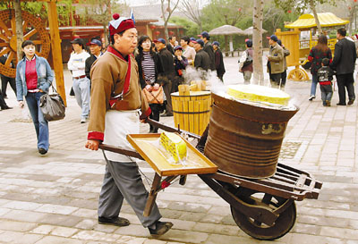 ■4月1日,一位賣小吃的商販在開封清明上河園內推車叫賣。當日,第二屆清明上河節在河南開封清明上河園開幕。清明上河節以《清明上河圖》為藍本,向遊客再現1000多年前北宋都城的社會風貌。新華社