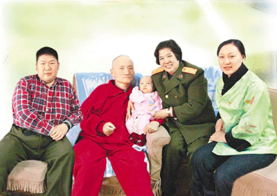 ■幸福的一家子:毛岸青(左二)與夫人邵華(右二)、兒子毛新宇(左一)、兒媳劉濱(右一)和剛滿月的孫子毛東東(中)在一起。