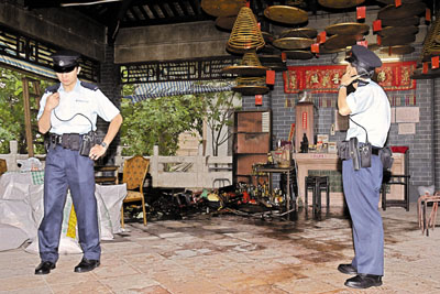 跑馬地藍塘道譚公廟昨晨發生火警,廟內懸掛在天花燃燒的塔香,疑跌下時未熄滅,香灰燒著放在地面的冥鏹和雜物,幸消防員迅速到場撲熄,無人受傷。