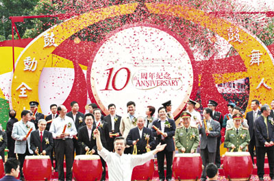 在一片鼓聲中,伴隨著回歸禮炮響起,在場嘉賓拉響紙炮、漫天彩片紛飛,「鼓舞人心、鼓動全城」的口號亦在台上展現出來。民政事務局局長何志平在致詞時表示,在回歸10年來香港保持繁榮,克服各種挑戰。他特別提到剛在西班牙取得世界冠軍的黃金寶,希望大眾以阿寶作為榜樣,努力不懈向前進,為香港作出貢獻。