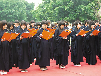 【本報珠三角新聞中心記者胡明、丘麗芳東莞電】大陸首家專為台商子弟提供教育的學校—東莞台商子弟學校首開台灣學生於大陸舉行成年禮的風氣,104名高二學生日前按照中華傳統禮教穿上明式的儒生長袍,在師長、嘉賓見證下進行授冠儀式。這群台商子弟因父母工作關係而離開台灣轉到大陸生活及學習,今次的成年禮讓他們體驗到傳統的文化及禮儀,更助他們認清自己的成長及未來的發展方向;他們當中不少人已立志留在大陸升學或就業,既尋找個人發展機會,也希望為兩岸交流及相互了解作貢獻。