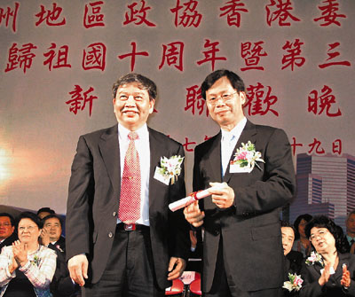 【本報訊】(記者 沈清麗) 廣州地區政協香港委員聯誼會日前假座華潤大廈展覽廳,隆重舉行慶祝香港回歸10周年暨第3屆理事會就職典禮新春聯歡晚會。中聯辦秘書長趙廣廷、外交部駐港副特派員解曉岩、立法會主席范徐麗泰及廣州市政協主席朱振中、市委常委、統戰部部長孔少瓊、市政協副主席郭錫齡、向東生、孫峰、潘勝燊等擔任主禮嘉賓,各界約900人出席,場面熱鬧。