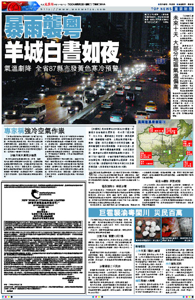 【本報訊】綜合新華社及中新社2日報道:中國近日各地氣候反覆無常,可以用「泥沙俱下,冰火共生,晨昏顛倒」來形容:南京泥雨不斷,瀋陽落塵14萬噸,上海出現浮塵天氣。廣東、福建、四川及重慶2日均突然受到風、暴雨和雞蛋般大的冰雹的襲擊,共有100多萬人受災。其中,廣州今晨遭暴雨襲擊,全城白晝如夜,廣東省中北部和東部的氣溫與1日相比,下降了7至11攝氏度,全省87個縣市更發出黃色寒冷預警信號;重慶由於雷擊和山泥傾瀉,共造成13死7傷;而福建和四川則合共有2,000多間民房受損。