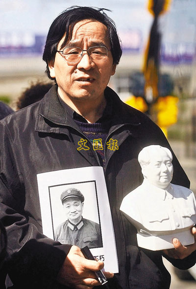 ■自發前來弔唁的群眾,右手抱著毛岸青生平畫冊,左手捧著毛澤東雕塑。 法新社