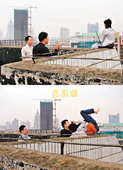 ■2日上午,廣西南寧市一名女子因感情糾葛,爬上高樓欲尋短見,消防官兵在樓下鋪好救生氣墊做好救援準備。上圖為談判專家勸說輕生女子,下圖為警察果斷採取強制措施將其救下。 中新社