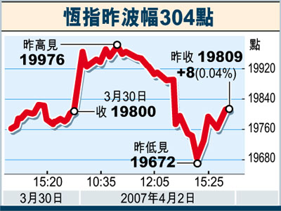 【本報訊】(記者 周紹基)受日本股市影響,港股昨日市況極為波動。恆指一開市跟隨外圍造好,一度急升170點,迫近20,000點水平,但受制於50天線的強大阻力,加上日股尾市急跌260點收市,令港股下午開市大跌,早上升幅化為烏有,更一度倒跌至19,672點,高低波幅達304點。但港股尾段受長和系傳出重組消息帶動,逐步收復失地,恆指最後收報19,809點,升8點,成交423.8億元。