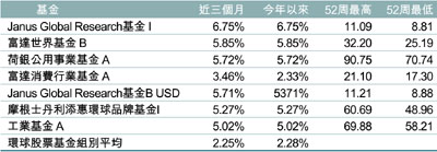 佔近今年以來榜首的Janus Global Research基金,基金成立於去年4月24日,基金平均市盈率為18.31倍。資產地區分佈為54.46% 北美、12.22% 已發展歐洲、9.3%英國、6.15% 日本、8.16% 已發展亞洲、4.82% 拉丁美洲、2.92% 新興亞洲、1.1% 澳大利亞及0.87% 新興歐洲。