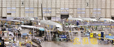■國家主席胡錦濤去年訪問美國前,中國宣布向美國購入波音飛機和黃豆等總值162億美元(約1,266億港元)貨物,緩和兩國緊張的貿易關係。圖為在華盛頓波音飛機製造廠,幾架正在組裝的波音737飛機。 資料圖片