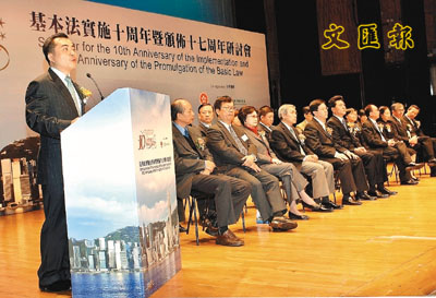 基本法推介聯席會議昨日與政制事務局合辦「《基本法》實施10周年暨頒佈17年研討會」,有近千名來自不同階層及年齡的市民參與。主禮嘉賓黃仁龍致辭時稱,香港自回歸以來經歷了多場嚴峻的考驗,包括禽流感、金融風暴、居留權風波等,唯香港人以至其他司法管轄區的政府也認同,香港在《基本法》的保障下,「一國兩制」在香港整體上得以成功落實;法治與司法獨立依然是香港社會自由開放的支柱,各種自由和權利在香港繼續受到尊重和保障。