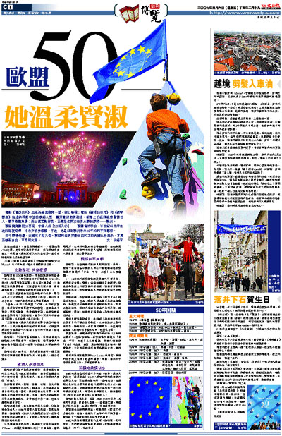 歐盟剛剛歡度50華誕,中國人說「50知天命」─歐盟當然明白,半世紀以來所走過的路程崎嶇;將來亦舉步維艱。不過,她最終為歐洲帶來50年的和平與繁榮。