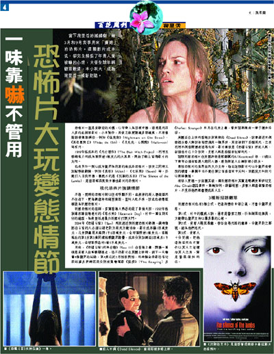 月前,《恐懼斗室3死神在齒》(Saw III)在香港上畫,開場一幕便是受害人自斬斷腳逃走,怪不得影片在英國上映時,創下一天嚇暈4個觀眾的紀錄。第4集已於2月拍板開拍,而兩個金像影后希拉莉絲韻及荷爾芭莉分別有驚嚇電影《魔疫》(The Reaping)及《Perfect Stranger》本月在北美上畫,看來這熱潮有一陣子還未冷卻。