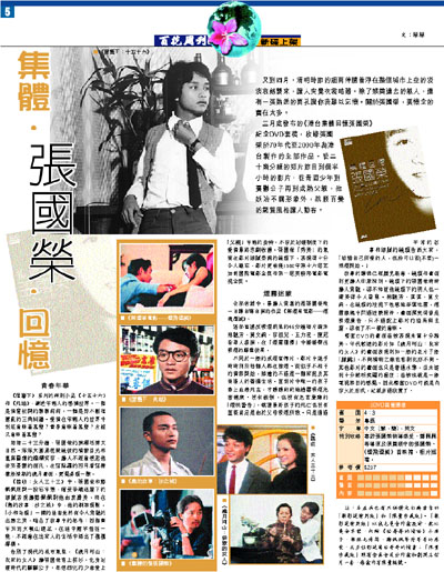 三月底發布的《港台集體回憶張國榮》紀念DVD套裝,收錄張國榮於70年代至2000年為港台製作的全部作品。從二十幾分鐘的短片節目到個半小時的影片,從青澀少年到憂鬱公子再到成熟父親,他妖冶不羈形象外,跳脫百變的氣質風格讓人動容。