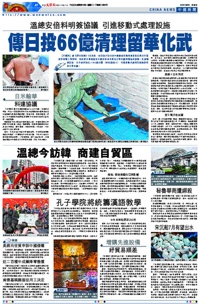 【本報訊】據《朝日新聞》9日消息:預定後天訪日的中國國務院總理溫家寶在與日本首相安倍晉三會談時,將針對日軍遺留在中國的有毒瓦斯等化學武器問題達成協議。在協議簽訂後,日本政府將投入940億日圓(約66億港元),引進移動式處理設施清除所有化學武器。