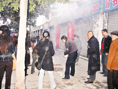 ■9日13時10分左右,成都錦江區東光轄區30多間臨街商舖發生屋簷垮塌事故,造成10死24傷。圖為死者家屬在事發現場祭奠親人。 本報成都傳真