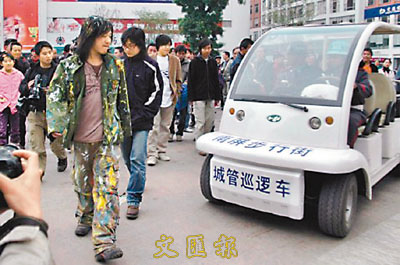 ■行為藝術引來步行街的管理人員關注,宣傳展板被工作人員拖走。 本報雲南傳真