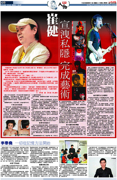 「我在寫劇本時,大多數時間也在聽音樂。」從走在中國搖滾前沿,到執導影片,崔健的第一套長片《給你一點顏色》,是從音樂劇和他的大碟延續下來的概念,傳聞今年年底開拍。「音樂和電影的根是一樣的,但是兩個完全不一樣的表現方式,對我來說,是左腳跟右腳,聽覺跟視覺的東西,也是互動。」但不論是音樂還是電影作品,崔健強調,要創作與生活有關係的藝術。