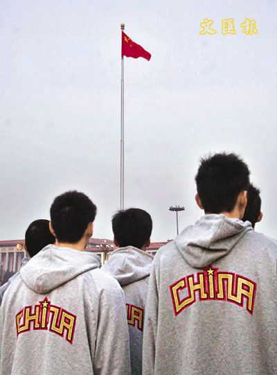 正在北京進行軍訓的中國國家男子籃球隊,昨晨來到天安門廣場,觀看升旗儀式(見圖)。然後,中國男籃參觀了中國人民解放軍陸海空三軍儀仗隊基地,及觀看了150人的「外國元首」級的三軍儀仗隊的閱兵式,令大家興奮異常。