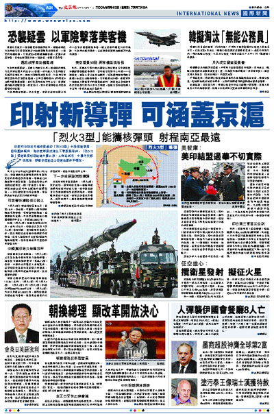 新德里的軍事專家表示,「烈火3型」試射成功,證明印度也是一個能夠使用戰略武器的核武大國,但印度尼赫魯大學國防戰略學家謝鋼坦承,印度雖具有核子武器,但缺乏洲際投射載具,估計他們下一個目標是研發洲際彈道導彈。 ■綜合外電消息/路透社/中央社/中新網