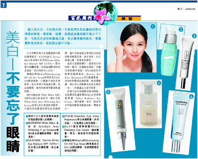 不少品牌的美白系列都會推出眼部護理產品。CLINIQUE Derma White肌本透白系列的Derma White Eye Moisture SPF 15/PA++ 肌本透白防曬眼霜,有助減褪眼部的衰老現象,美白同時注入水份。