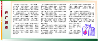 很多人希望做定期身體檢查,可以發現身體病變。女性方面,子宮頸癌可以通過定期的子宮頸細胞檢查發現癌前期病變,用電刀或激光將變壞了的細胞和組織切除,防止進入癌症期。