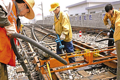 ■全國鐵路周三將第六次大提速。圖為上海鐵路工人檢修鐵軌。新華社