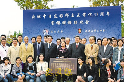 【本報上海新聞中心記者章蘿蘭14日電】35年前為慶祝中日邦交正常化,中國曾將大熊貓作為禮物贈予日本,而日本則以櫻花樹回贈。今年適逢中日友好邦交35周年,日本慶應大學三田會上海分會向上海復旦大學贈送了第一批35棵櫻花樹,寓示中日兩國情誼像櫻花那樣美麗動人。14日,兩大名校在此間聯合舉辦賞櫻贈櫻活動,並親手將這35棵櫻花樹栽種於復旦大學江灣新校園內。上海三田會同復旦在慶應大學留學或進修過師生近百人參加了這次賞櫻贈櫻聯歡會。