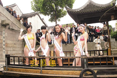 14日,參加2007國際旅遊小姐中國區總決賽的38位佳麗首次亮相浙江古鎮西塘。身著比基尼的佳麗們乘船遊覽西塘時,受到眾多遊客圍觀。 中新社