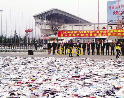 14日,全國各地舉行2007「掃黃打非」春季戰役盜版非法出版物集中銷毀活動。圖為長春市集中銷毀了查繳的大量盜版非法出版物。 新華社