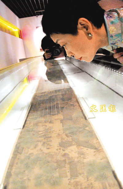 ■一位遊客在北京故宮博物院仔細觀賞展櫃中的真本《清明上河圖》。