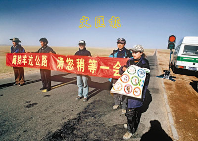 ■志願者在青藏公路上為藏羚羊「保駕護航」。