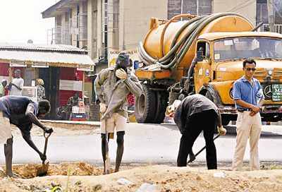 ■中國一家電信公司在尼日利亞鋪設電話線路。 資料圖片