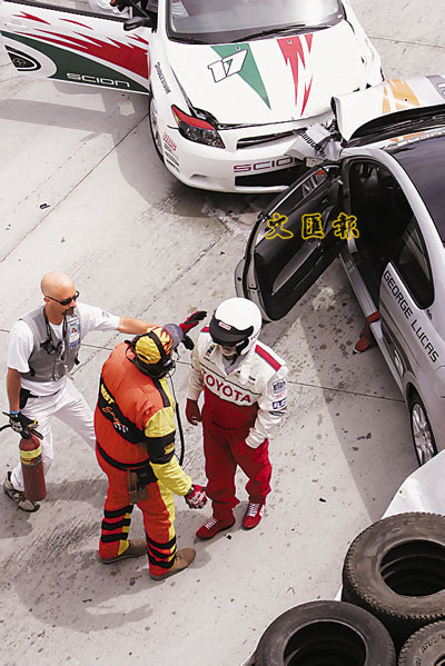 名車品牌「Toyota」前天在加州舉行一個「名人格蘭披治大賽」,是次活動吸引了電影界巨頭佐治魯卡斯參加,不過魯卡斯在第一場練習賽就與另一參賽者來個「對對碰」,雖然沒什麼大礙,但賽車就冇得坐,要坐救護車,唉,一把年紀既魯卡斯要就住玩呀! ■文:飛馬