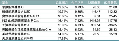 受到最近國際油價激勵,包括能源基金的天然資源基金組別第一季也以超過8%的平均升幅擠進表現榜前十名。