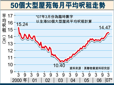 【本報訊】美聯集團首席分析師劉嘉輝表示,私樓租金表現理想,以全港50個大型屋苑計算,自去年10月份平均呎租13.62元逐步上升至今年3月份約14.47元,呎租更較去年底上升3.4%,走勢持續5個月錄得升幅,並創自00年3月後7年新高。